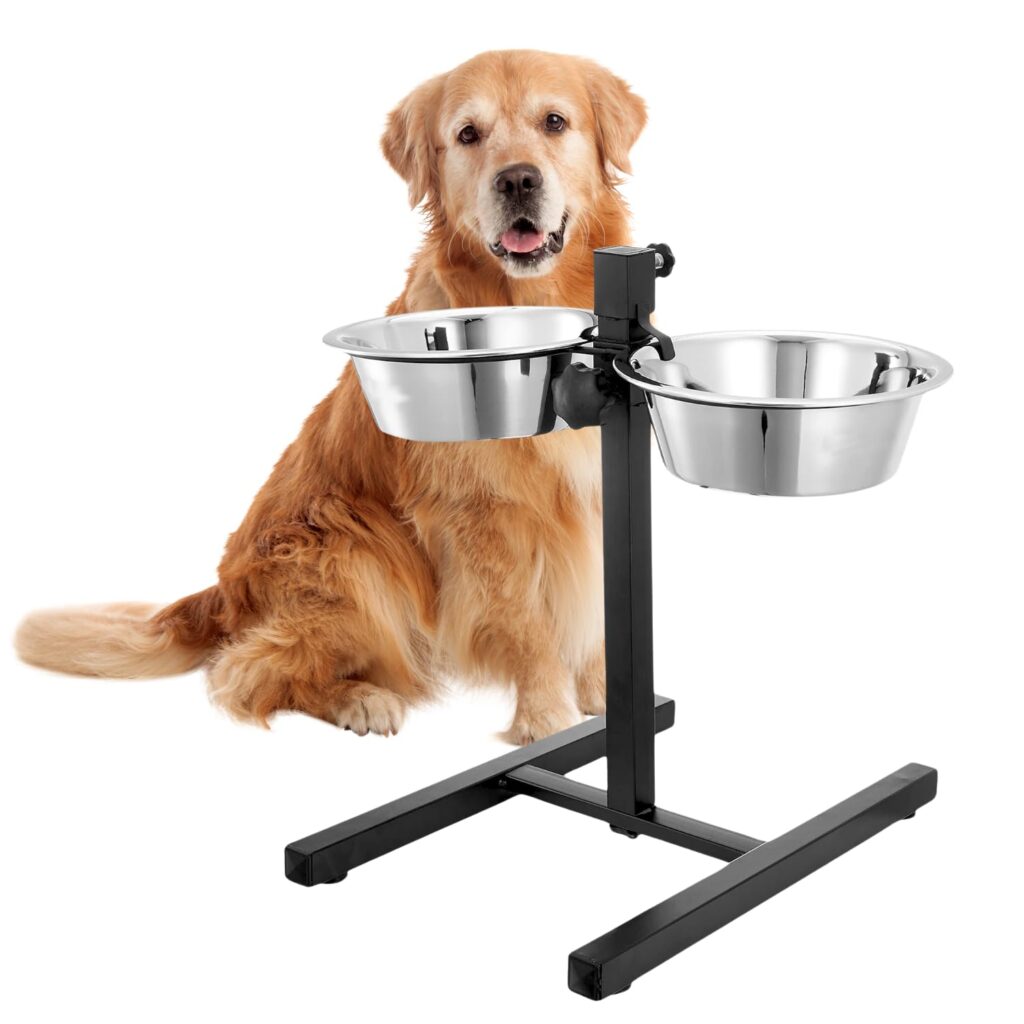 Amazon Basics Adjustable Double Diner for Pet Food and Water | 1500 ml Each | Two Removable Stainless Steel Bowls | Cat and Dog Food Bowl | Adjustable Height | Extra Rubber Support | H-Base