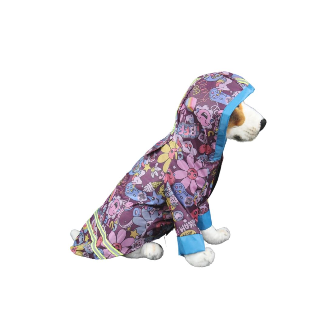 - WATERPROOF DESIGN: Fashionable purple floral pattern raincoat featuring blue trim and reflective stripes keeps pets dry and visible during rainy walks.